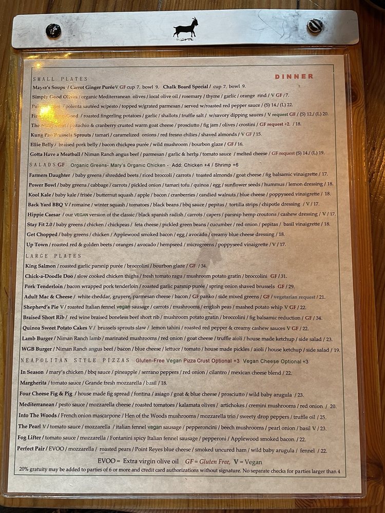 Wild Goat Bistro, located in Petaluma, CA, offers a diverse New American Pizza menu with vegan and limited vegetarian options. The restaurant is known for its wheelchair accessible facilities, QR code menus, and sustainable practices like compostable containers. With a casual and family-friendly atmosphere, Wild Goat Bistro is perfect for both lunch and dinner. The restaurant provides waiter service, free Wi-Fi, and outdoor seating, including heated and covered options. As a food reviewer, I appreciate their commitment to using plastic-free packaging and providing reusable tableware. The menu features a selection of beer and wine, along with happy hour specials. Overall, Wild Goat Bistro caters to a wide range of preferences and dietary needs, making it a versatile dining destination worth trying.
